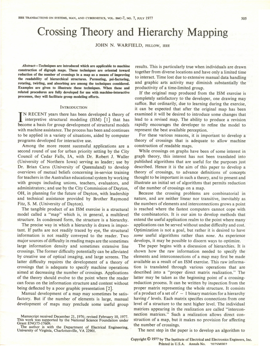 A team of Japanese researchers K. Sugiyama, S. Tagawa and M. Toda, at Fujitsu, Ltd. In Tokyo, developed and published in 1981 a superior algorithm for structuring, based on the work Warfield did in "Crossing Theory & Hierarchical Mapping". It is titled: "Effective Representations of Hierarchical Structures, Research Report No.8." See a Japanese paper "Methods for Visual Understanding of Hierarchical System Structures” and see also the Fujitsu Research Report on which the Japanese journal article is based.